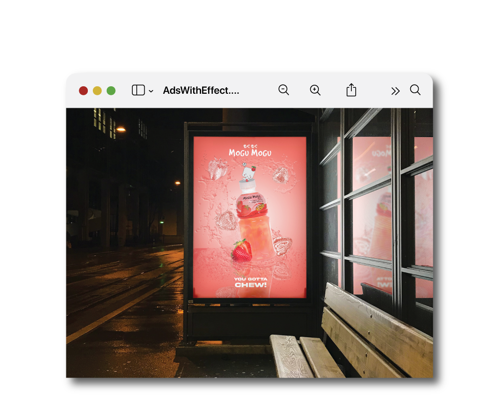For this project the goal was to rebrand the advertisement for Mogu Mogu, focusing on visually communicating its strawberry flavor in a creative way. The design features a dynamic splash of water that takes the shape of a strawberry, symbolizing the refreshing taste of the drink. The concept is to blend the natural fruit essence with the energy of the splash, creating an eye-catching visual that instantly conveys the flavor to the audience. This imagery reflects the drink's freshness and vibrancy, aligning with the brand's fun and youthful identity. The rebranding emphasizes both the flavor and the refreshing qualities of Mogu Mogu, making it more appealing and memorable for consumers.