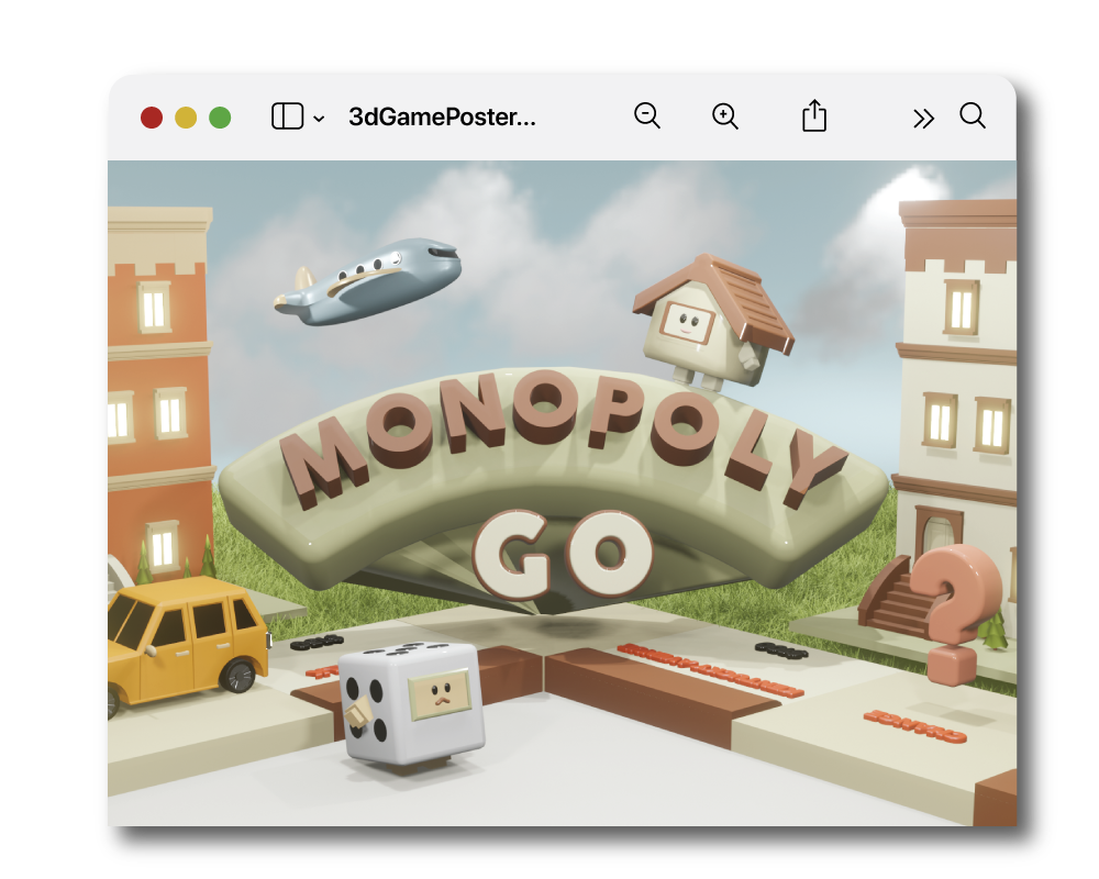 In this project, I recreated the Monopoly Go game poster with a playful twist, transforming it into a cute, cartoonish 3D version using Blender. My aim was to give the poster a more lighthearted and fun vibe that appeals to a wide audience, especially younger players.