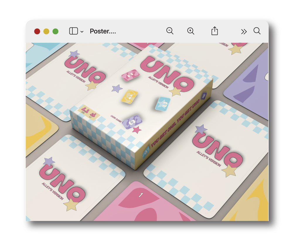 In this project, I rebranding UNO card game with a pastel-colored theme, giving it a trendy and playful. Alley's Version uses soft pastel tones, cute illustrations, and a modern, minimalist design to make the game feel fresh and visually appealing. The cards are designed to be more youthful and inviting, combining fun elements with a calming color palette that adds a whimsical touch.